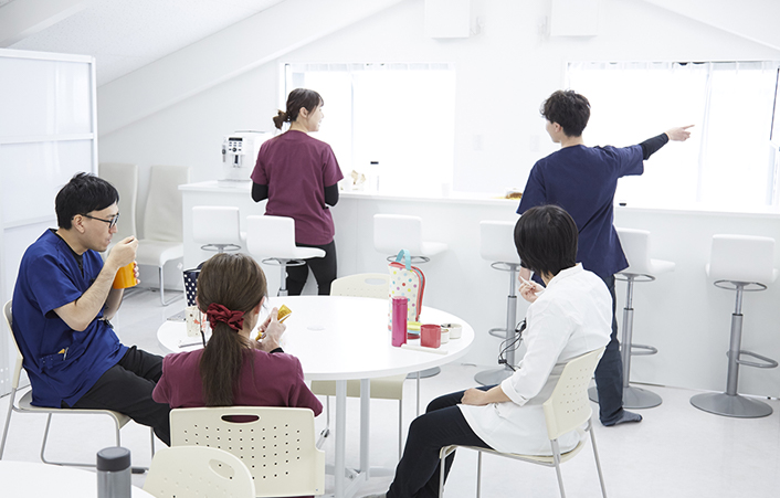 院外の勉強会に積極的に参加し、患者様への新しい提案を考えたり、より専門性の高い治療のステップアップを目指しています。冨森歯科医院のスタッフルームに個別ロッカーや広いラウンジがあるので、休憩時間はみんなとランチを楽しむなどリフレッシュしながらイキイキと働くことができます。